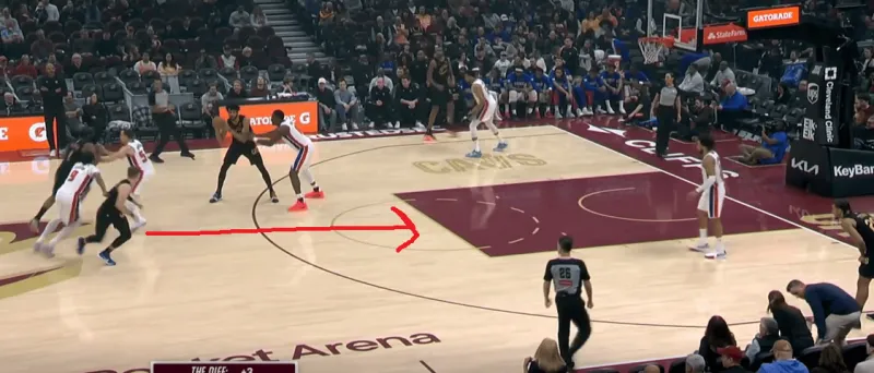 这一次也是同样的道理,在阿伦引导右侧的掩护下,泰森变向走左侧过掉了CC,从而吸引了活塞的防守收缩,